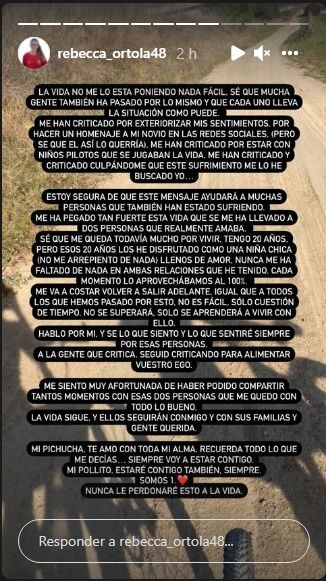 Luego de la publicación en sus redes sociales, Rebecca Ortola salió al cruce desde sus historias de Instagram. Allí escribió: "La vida no me lo está poniendo nada fácil. Sé que mucha gente ha pasado por lo mismo y que cada uno lleva la situación como puede. Me han criticado por exteriorizar mis sentimientos, por hacerle un homenaje a mi novio en las redes sociales. Pero sé que él así lo querría. Me han criticado por estar con niños pilotos que se jugaban la vida, me han criticado y criticado culpándome que este sufrimiento me lo he bucado yo".