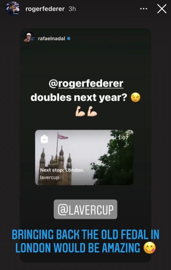 El español lo hizo a través de una historia en su cuenta oficial de Instagram: "Roger, ¿jugamos dobles juntos el año que viene?". El suizo, claro, necesitó apenas un par de horas para responder al pedido y dejar la opción abierta: "Traer de vuelta a la vieja sociedad Fedal en Londres sería increíble". Los fanáticos, entonces, enloquecieron con la posibilidad de volver a verlos juntos en un partido por duplas.