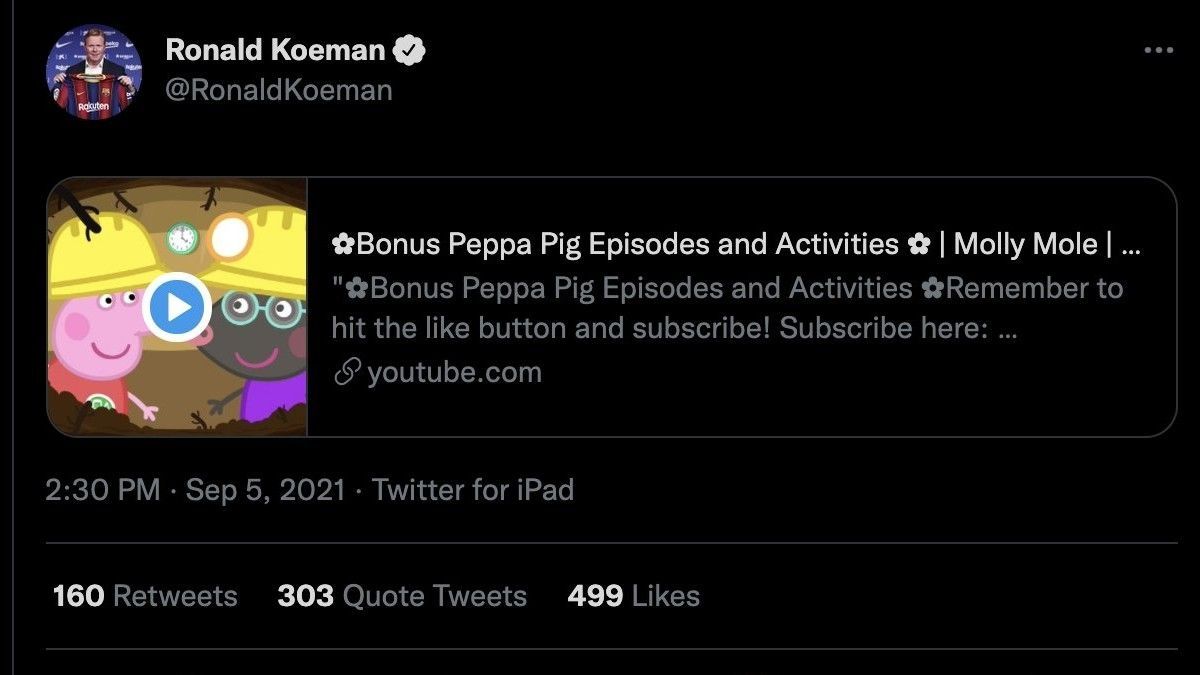 Ronald Koeman ha dejado por unos momentos a los hinchas del Barcelona en un gran mar de dudas tras publicar un tuit en su cuenta oficial de Twitter con un enlace hacia un episodio de los conocidos dibujos animados para niños Peppa Pig.