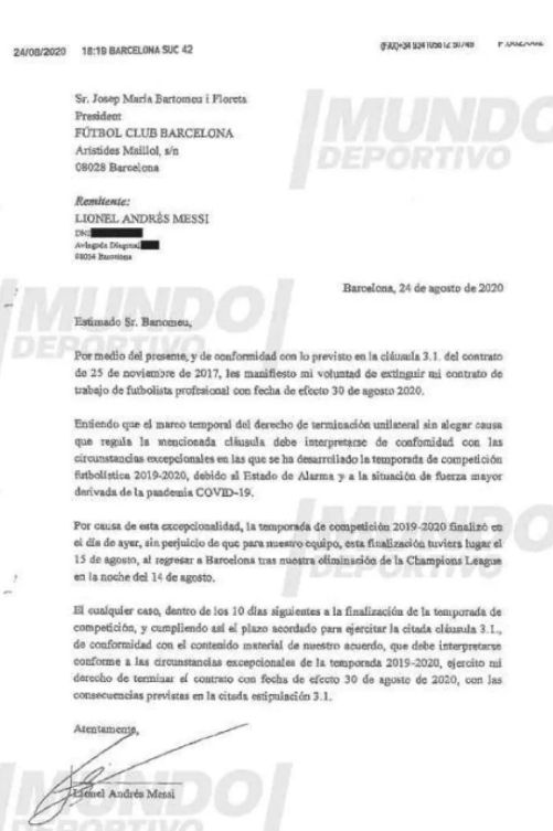 El 24 de agosto de 2020, Messi y su entorno redactaban una carta a Josep María Bartomeu, enviada a través de un burofax, en la que el argentino, harto de la crisis deportiva e institucional del club, dejaba clara sus intenciones de abandonar el equipo el día 30 de ese mes, haciendo a una cláusula del contrato que le permitía liberarse unilateralmente. Ese burofax ha sido desvelado en el día de hoy.