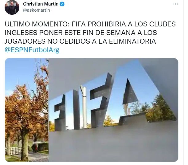 Christian Martin, reconocido cronista internacional, escribió en sus redes sociales que "FIFA le prohibiría a los clubes ingleses poner este fin de semana a los jugadores no cedidos a las Eliminatorias". Esta urgente medida tiene como objeto presionar y dejar en claro que es una obligación permitirle a los jugadores que puedan defender la camiseta de su país.