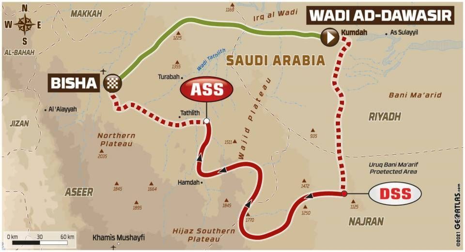 Pero no conviene precipitarse por culpa de la velocidad, sobre todo porque los competidores tendrán que lidiar con un gran número de cruces de pistas, marca de la casa en Arabia. Unirá las ciudades de Wadi Ad Dawasir y Bisha con una distancia total de 735 kilómetros, 375 cronometrados.