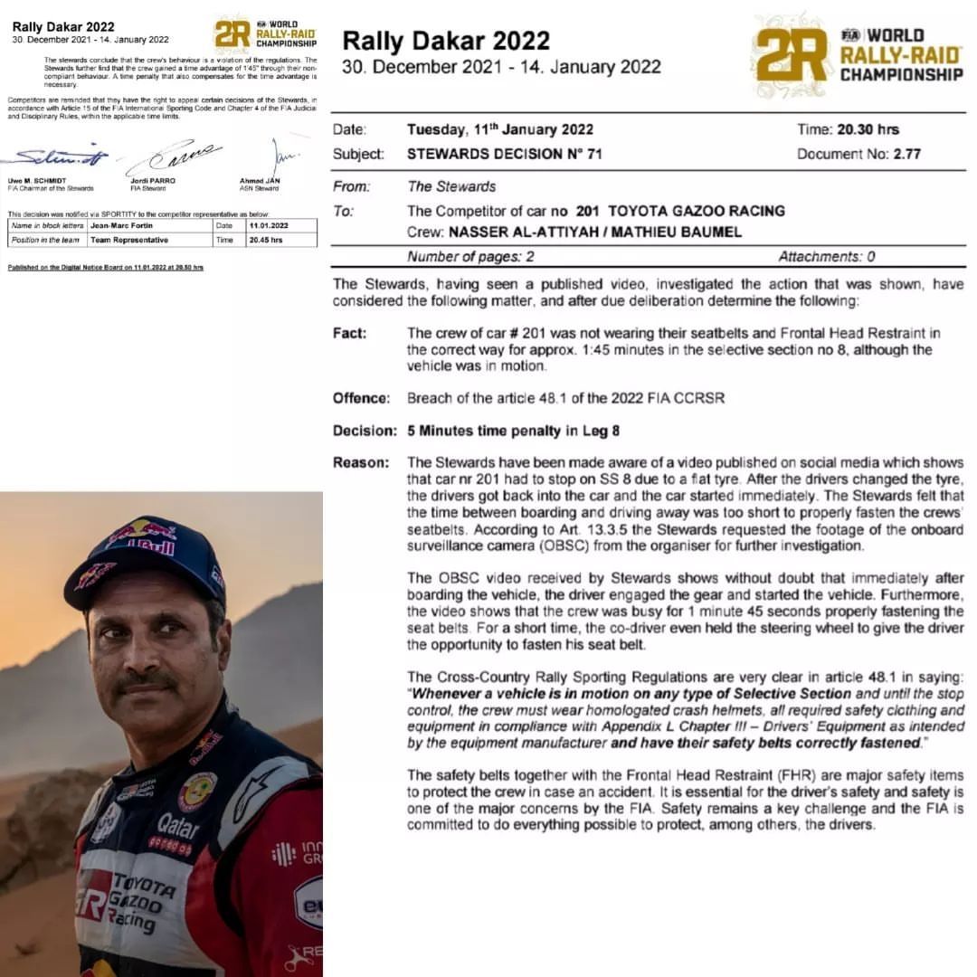 Los comisarios deportivos de la Federación han considerado oportuno sancionar al qatarí por no haberse puesto correctamente los cinturones de seguridad de su Toyota tras cambiar la rueda después del pinchazo. Según han explicado los comisarios, la razón de esto es que observaron en un vídeo publicado en redes sociales por el propio Dakar que, tras el cambio de neumáticos, Al-Attiyah y Baumel remprendieron la marcha a una velocidad demasiado rápida como para tener los cinturones de seguridad abrochados.