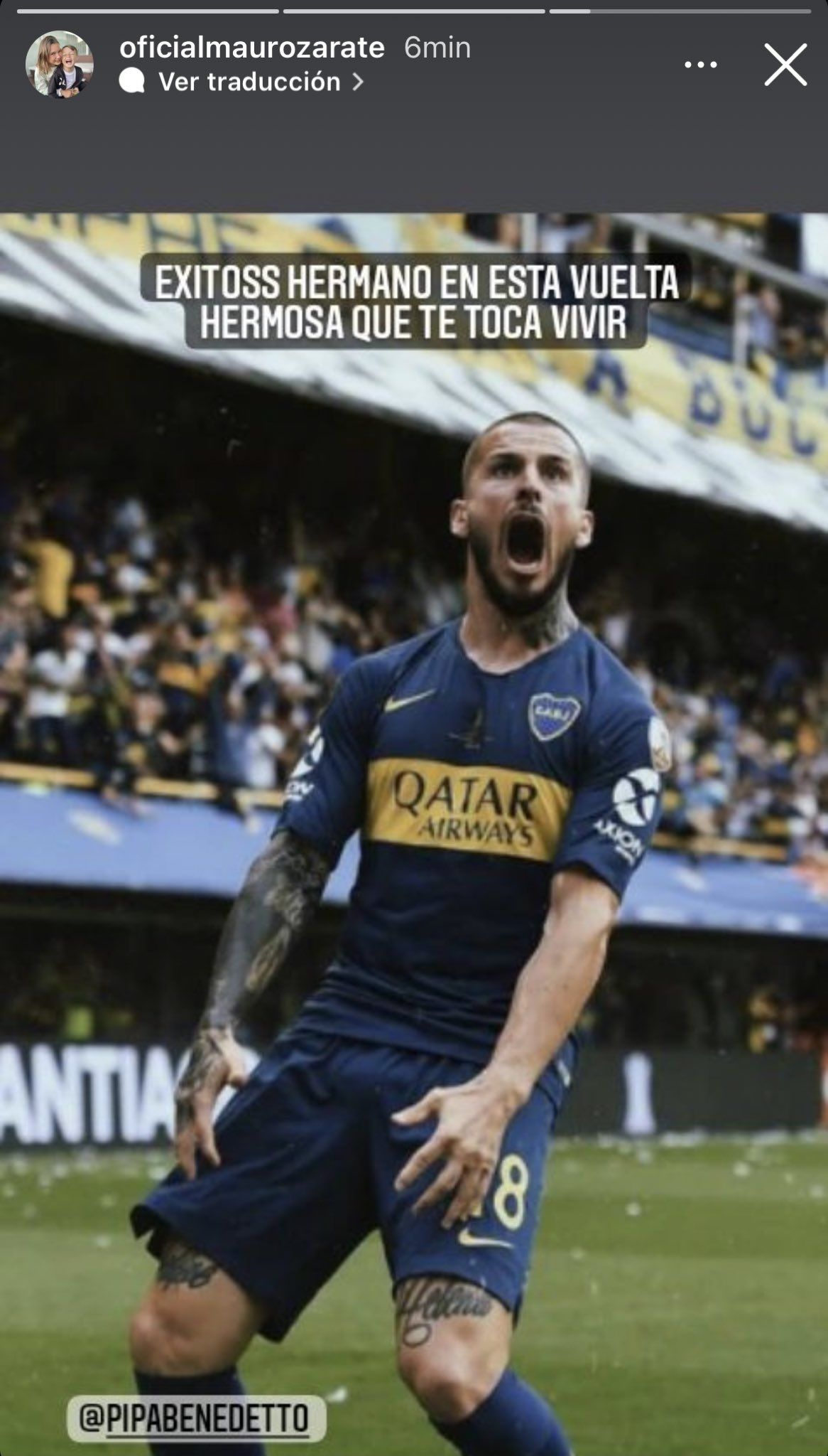 Mauro Zárate, ex compañero de Benedetto en Boca y actual jugador del América Mineiro de Brasil, le dedicó una historia de Instagram a su amigo. "Éxitos hermano en esta vuelta hermosa que toca vivir", publicó el ex jugador de Vélez Sarsfield, junto a una foto del Pipa gritando un gol de cara a la tribuna de la Bombonera.