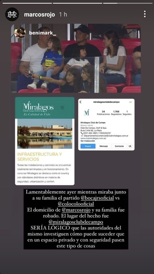 Según informó el periodista especializado en policiales, Mauro Szeta, mientras el ex central de la selección argentina disfrutaba del encuentro de Boca, un grupo de ladrones entraron a su casa en el country privado Miralagos de Olmos y se robaron varios objetos de valor, como joyas y medallas que Rojo ha obtenido con Boca. El jugador publicó una historia en su Instagram con el siguiente mensaje: “Sería lógico que las autoridades de Miralagos Club de Campo investiguen cómo puede suceder que, en un espacio privado y con seguridad, pasen este tipo de cosas”.