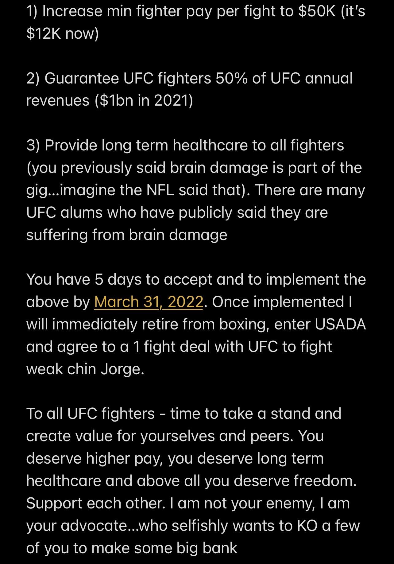 Pero además, para que cumpla con eso, le solicitó a White que se mejore el estado de los peleadores en la UFC, a quienes pide que les paguen mejor. En total las peticiones que hizo fueron tres y puso un plazo de cinco días para recibir una respuesta. El comunicado finaliza con un mensaje a los luchadores.