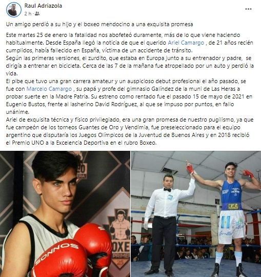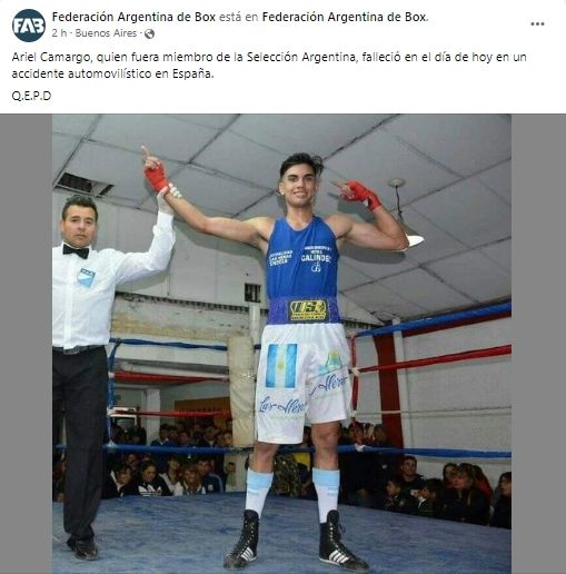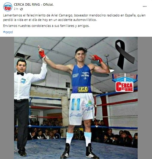 Ariel Camargo, boxeador oriundo de Algarrobal - Las Heras que hace cuatro meses se encuentra radicado en Elche - España, perdió la vida en un accidente de tránsito. Camargo se dirigía en bicicleta a uno de sus entrenamientos cuando fue embestido por un vehículo. El mendocino perdió la vida de forma inmediata.