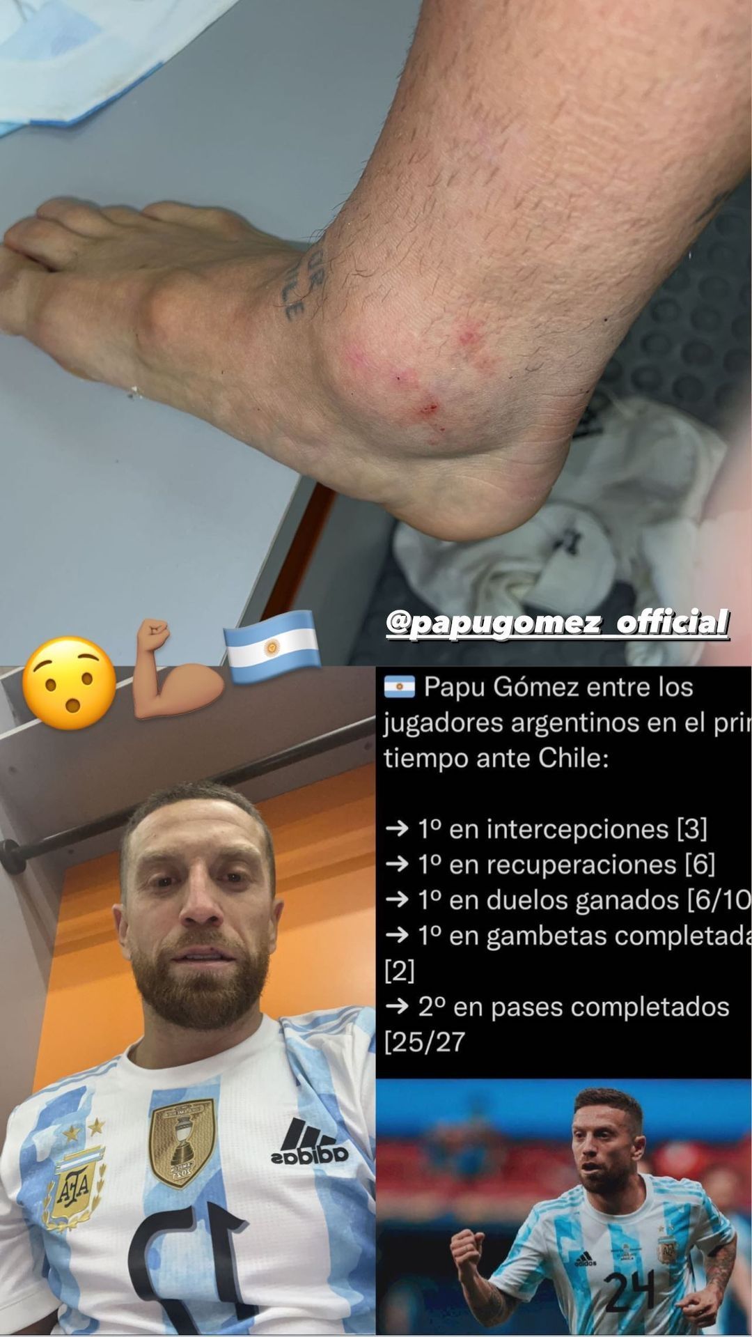 Luego del encuentro la esposa del jugador eligió las historias de Instagram para viralizar una imagen que le envió desde el camarín del estadio Los Zorros. Junto a tres emoticones la cuenta @linda.raff mostró el tobillo del Papu, que terminó hinchado y con marcado signo de maltrato por parte de los jugadores chilenos.