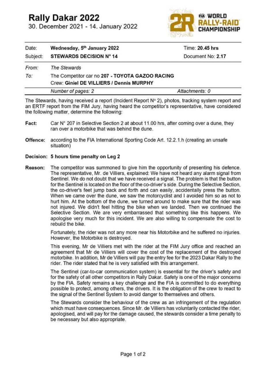 Y agregó: "En la parte inferior de la duna, nos dimos la vuelta para asegurarnos de que el motorista no estaba herido. No sentimos el golpe de la moto al aterrizar. Luego continuamos el tramo. Estamos muy avergonzados de que ocurra algo así". Ahora, con la pena, el sudafricano pasó del 6° al 38º lugar en la clasificación general a 5h49m del líder de la carrera Nasser al-Attiyah.