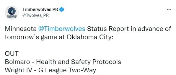 La confirmación de que Bolmaro ingresó en los protocolos de salud y seguridad de la NBA y por lógica consecuencia no estará mañana ante Oklahoma City Thunder (este miércoles se habían enfrentado en el Target Center, de Minnesota, con victoria local por 98 a 90, y el oriundo de Las Varillas no vio acción), fue realizada por los Timberwolves.