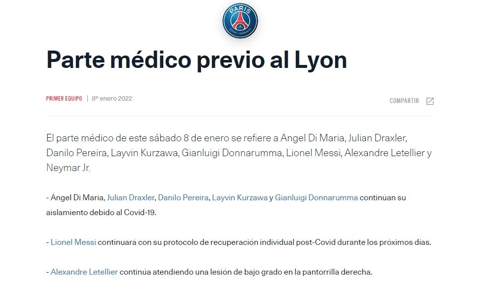 El ganador de siete Balones de Oro, también ausente en el primer juego del año por la Copa de Francia, contrajo coronavirus en los últimos días de 2021 y permaneció aislado en su ciudad natal, Rosario, hasta el miércoles pasado cuando pudo viajar hacia París previo test PCR negativo.