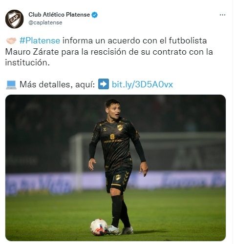 "Platense informa que llegó a un acuerdo con el futbolista Mauro Zárate para la rescisión de su contrato con la institución. Tras haber conseguido el objetivo, y luego del partido con Huracán, se sentaron las partes para acordar mutuamente la finalización del contrato, donde el delantero percibirá hasta el último día trabajado. Gracias Mauro y éxitos en lo que venga para tu carrera", cerró.