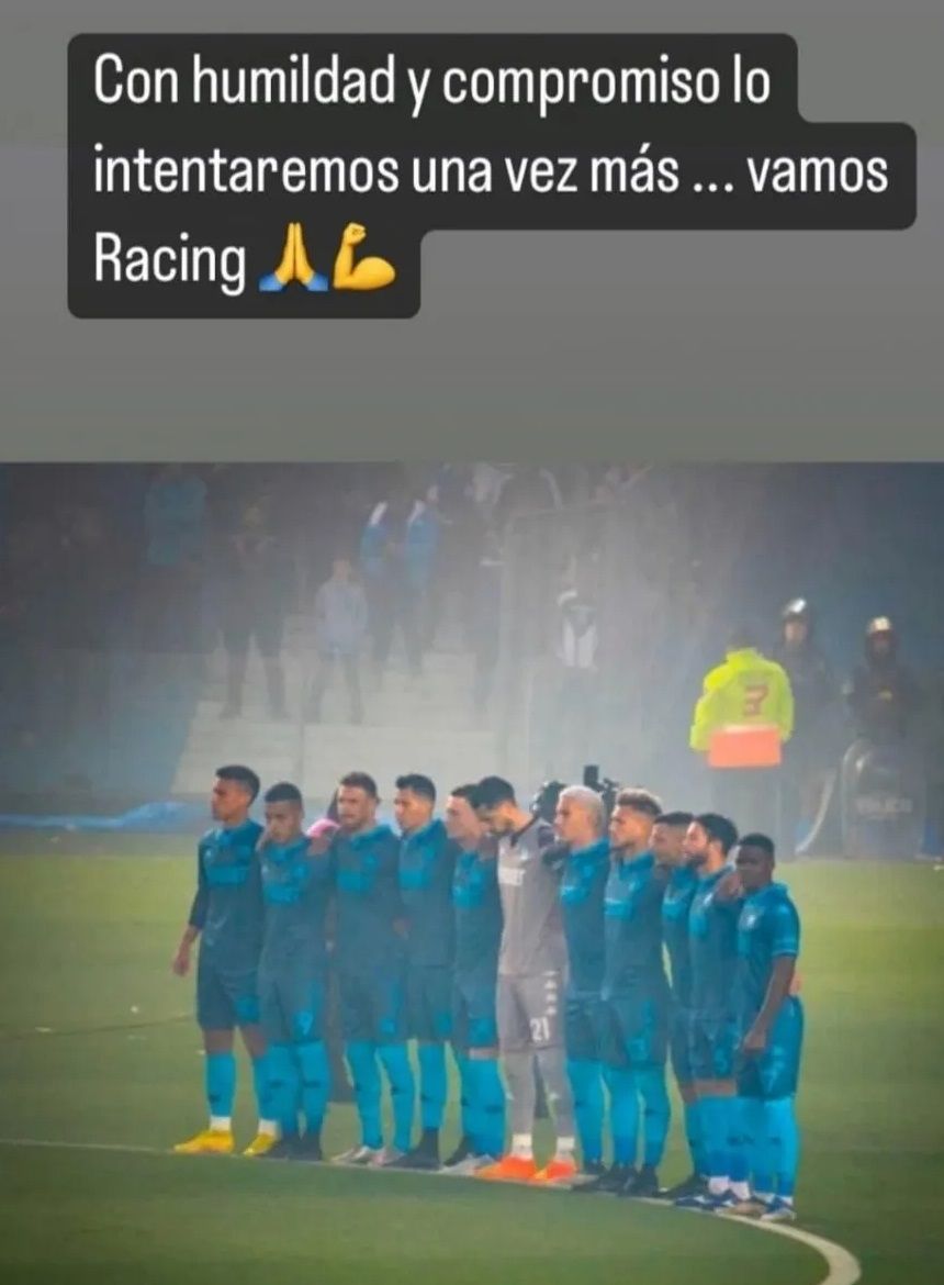 "Con humildad y compromiso lo intentarán una vez más... Vamos Racing", escribió junto a una foto con sus compañeros. El ex Rosario Central tiene contrato con Racing hasta diciembre de este año, pero por su lesión (Tendrá una recuperación superior a seis meses) no quedará libre, aunque aún no definió su futuro.