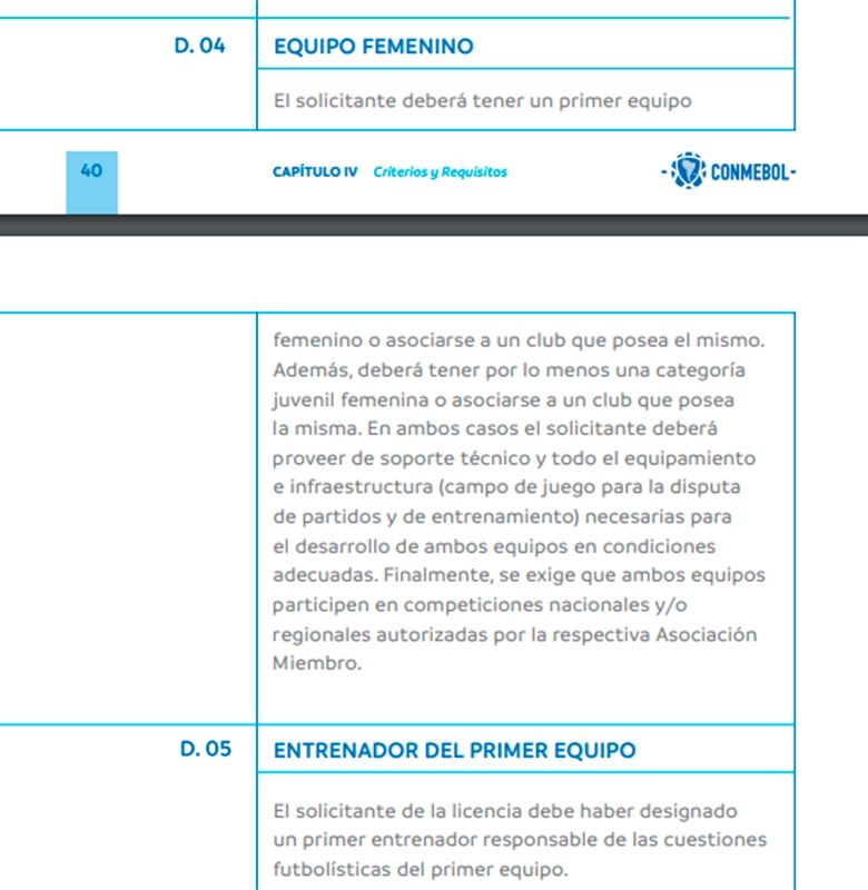 En el criterio deportivo D.04 de su "Reglamento de Licencia de Clubes", desarrollado en su página Nº40, la Conmebol deja en claro que "el club solicitante (a participar de cualquier competencia suya, como la Libertadores) deberá tener un primer equipo femenino o asociarse a un club que posea el mismo y por lo menos una categoría juvenil femenina o asociarse a un club que posea la misma". Y agrega: "En ambos casos el solicitante deberá proveer de soporte técnico y todo el equipamiento e infraestructura (campo de juego para la disputa de partidos y de entrenamiento) necesarias para el desarrollo de ambos equipos en condiciones adecuadas. Finalmente, se exige que ambos equipos participen en competiciones nacionales y/o regionales autorizadas por la respectiva Asociación Miembro".