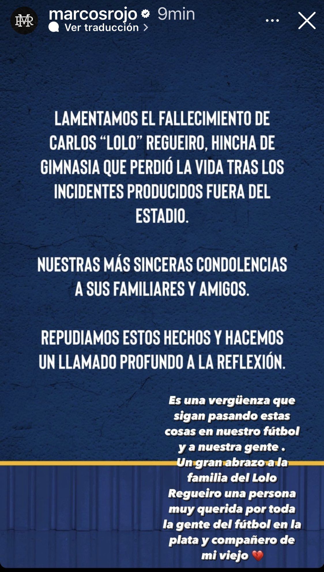 "Lamentamos el fallecimiento de Carlos "Lolo" Regueiro. Hincha de Gimnasia que perdió la vida tras los incidentes producidos fuera del estadio. Nuestras más sinceras condolencias a sus familiares y amigos. Repudiamos estos hechos y hacemos un llamado profundo a la reflexión", escribió Rojo en su historia.