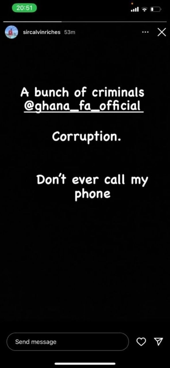Más tarde, mediante el mismo medio, Calvin Riches sentenció: "Un grupo de criminales en la Ghana FA Official. Corrupción. Nunca llamen a mi teléfono". "País de mierda, ojalá se queden eliminados, que se joda Ghana".