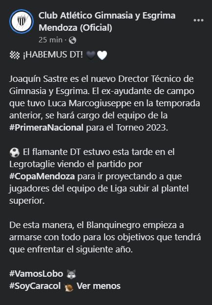 Luego, el posteo entra en más detalles: "El ex-ayudante de campo que tuvo Luca Marcogiuseppe en la temporada anterior, se hará cargo del equipo de la Primera Nacional para el Torneo 2023". Probablemente, la contratación de la mano derecha del ex DT sea en búsqueda de una línea continuista con lo logrado esta última temporada.