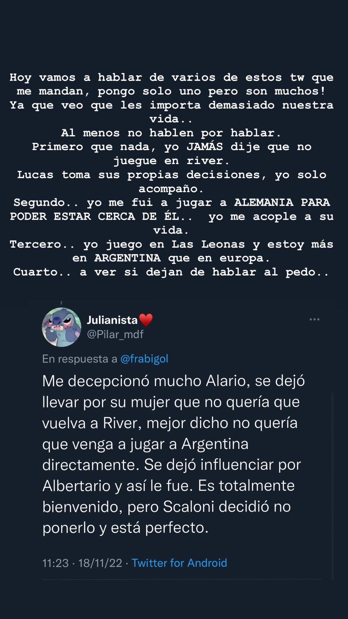 Cansada de las críticas sinsentido, la jugadora de hockey subió uno de los tantos tuits que la nombraron culpable de que Alario no haya vuelto a River para ganar más minutos de cara al Mundial de Qatar 2022: "Me decepcionó mucho Alario, se dejó llevar por su mujer que no quería que vuelva a River. Mejor dicho, no quería que venga a Argentina. Se dejó influenciar por Albertario y así le fue. Es totalmente bienvenido, pero Scaloni decidió no ponerlo y está perfecto", escribió un usuario.