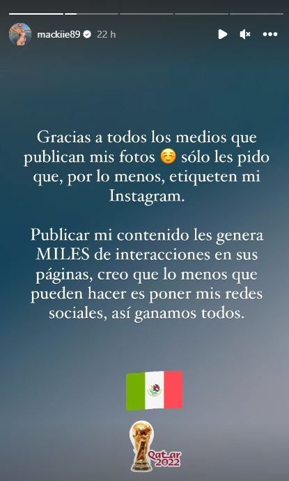 "Gracias a todos los medios que publican mis fotos. Sólo les pido que, por lo menos, etiqueten mi Instagram. Publicar mi contenido les genera miles de interacciones en sus páginas, creo que lo menos que pueden hacer es poner mis redes sociales, así ganamos todos", fue el mensaje que compartió la modelo, bastante molesta, en su cuenta de Instagram.