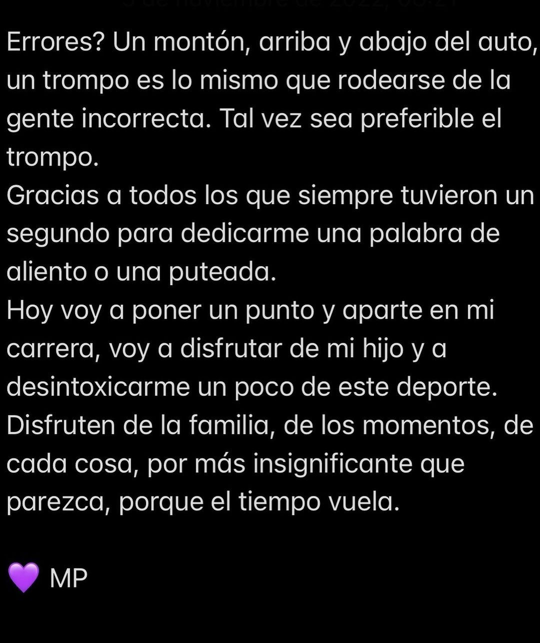 Luego, agregó: “Después vinieron tiempos más difíciles en lo deportivo, pero aprendí con los años a disfrutar otras cosas. En definitiva lo único que cuenta es disfrutar, estamos de paso. ¿Errores? Un montón, arriba y abajo del auto. Un trompo es lo mismo que rodearse de la gente incorrecta. Tal vez sea preferible el trompo".