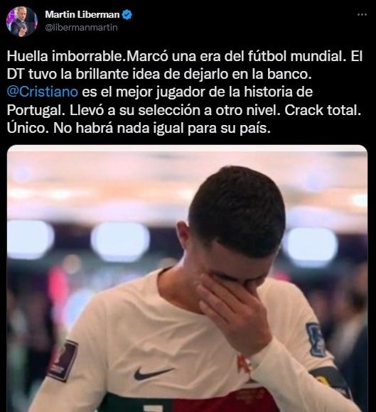 Portugal se despidió del Mundial de Qatar tras caer ante Marruecos, pero el mundo habla de la polémica decisión de Fernando Santos quien dejó a Cristiano Ronaldo en el banco de suplementes y lo hizo ingresar en el complemento de un partido muy duro, con pocos espacios y caliente. Ante esto, Martín Liberman fue uno de los primeros en apuntar contra el entrenador luso y usó sus redes sociales para escribir un lapidario tuit una vez consumada la despedida del equipo europeo.