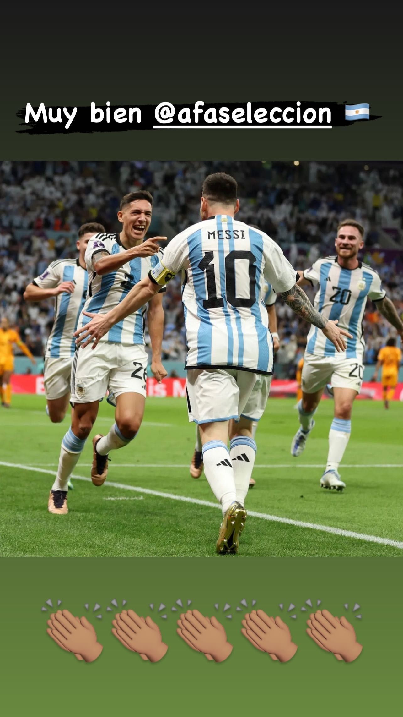 "¿Quién más que tú, extraterrestre?", fue lo primero que escribió junto a un video de su excompañero en Barcelona marcando el segundo gol ante Países Bajos y luego, en la siguiente historia, posteó: "muy bien @afaselección". Vidal siguió el partido desde un fan zone situado en Dubai, donde disfruta de unas días de descanso junto a su familia.