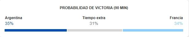 Según lo dado a conocer, Argentina tiene una mínima ventaja con respecto a su rival y las probabilidades de que gane el duelo durante los 90 minutos son del 35%. Francia, por su parte, tiene un 34% de chances y hay un 31% de que la final a disputarse en Lusail se defina en el tiempo suplementario.