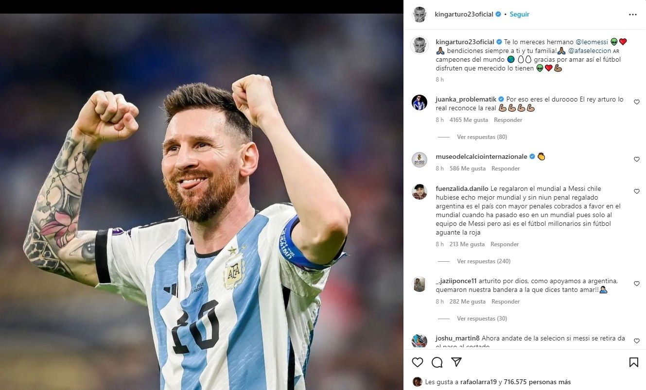 Arturo Vidal causó una fuerte polémica en su país tras celebrar la corona lograda por la Selección argentina. El futbolista chileno coincidió con Lionel Messi en Barcelona y generaron una gran amistad entre ellos, como también con sus familias. Es por eso que, una vez que el 10 levantó la Copa del Mundo en Qatar, el "Rey" realizó varios posteos en su cuenta de Instagram para saludarlo.