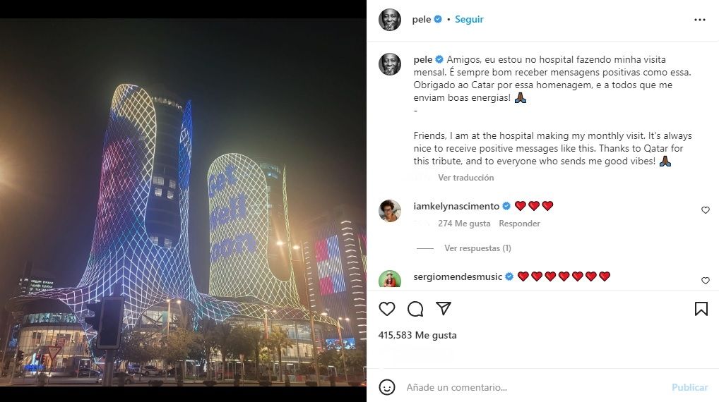 "Amigos, estoy en el hospital haciendo mi revisión mensual. Siempre es lindo recibir mensajes positivos como este. ¡Gracias a Qatar por este homenaje y a todos los que me envían buenas vibraciones!", publicó Pelé en Instagram en un mensaje que acompañaba imágenes del homenaje.