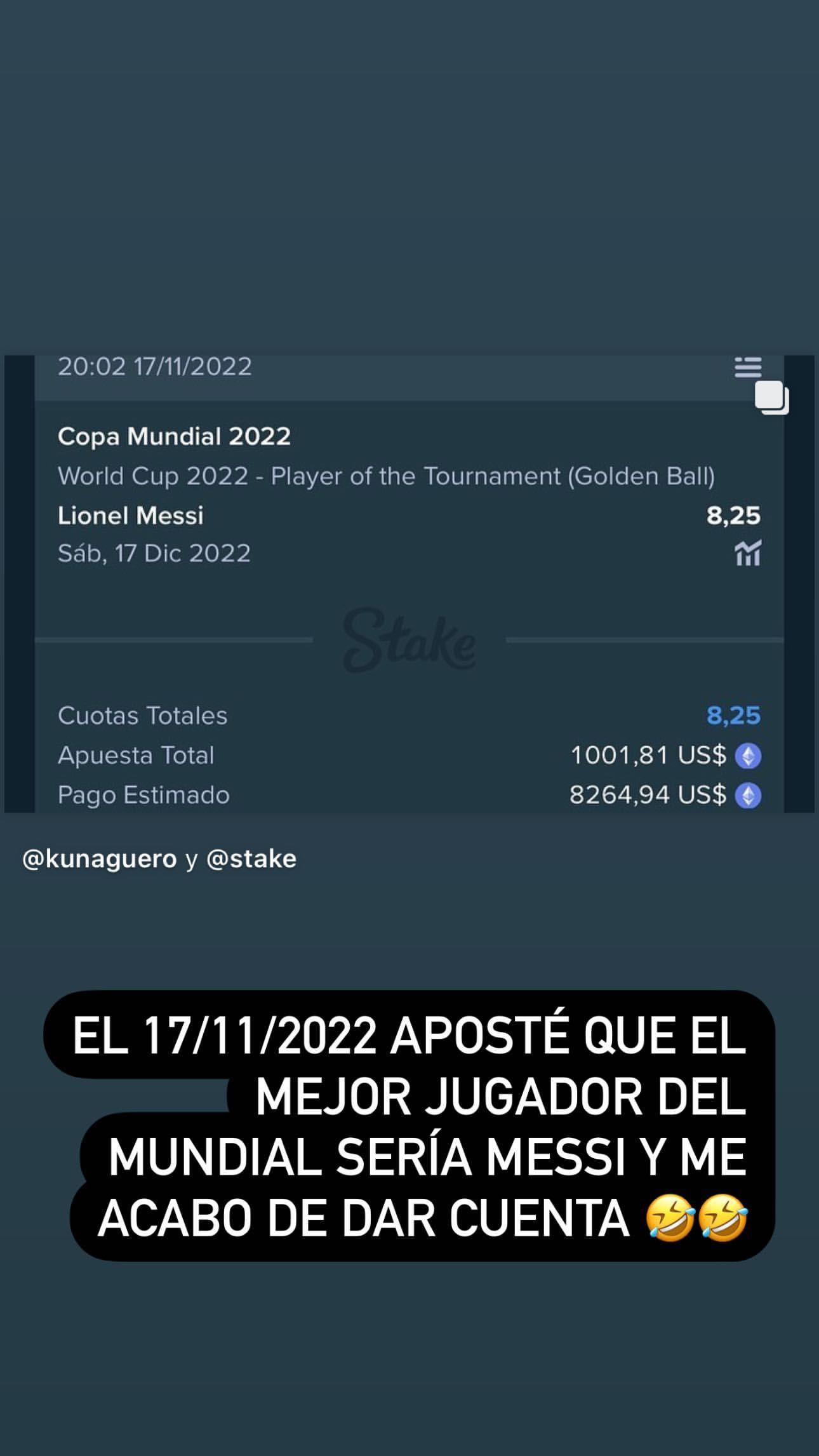 "El 17/11/2022 aposté que el mejor jugador del Mundial sería Messi y me acabo de dar cuenta", escribió el exdelantero argentino en su cuenta de Instagram, con la captura de pantalla del premio que se ganó por jugar por el 10.