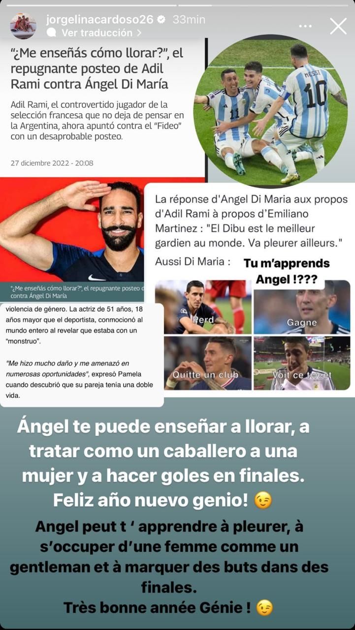 Junto al mensaje directo al francés, Cardoso acompañó con varias capturas de las noticias de los últimos días. Sin embargo, también publicó una nota sobre el pasado violento de Rami, algo que los argentinos descubrieron cuando este empezó a disparar contra los campeones del mundo.