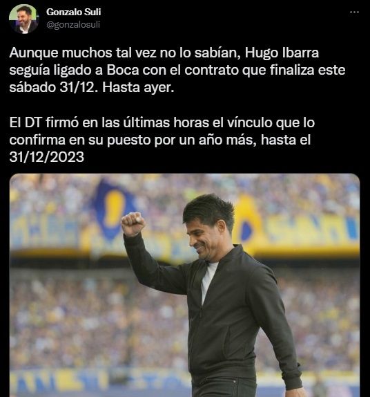 El periodista Gonzalo Suli, panelista de La Noche de TyC Sports, lo confirmó mediante una publicación en las redes sociales: "Aunque muchos tal vez no lo sabían, Hugo Ibarra seguía ligado a Boca con el contrato que finaliza este sábado 31/12. Hasta ayer. El DT firmó en las últimas horas el vínculo que lo confirma en su puesto por un año más, hasta el 31/12/2023".