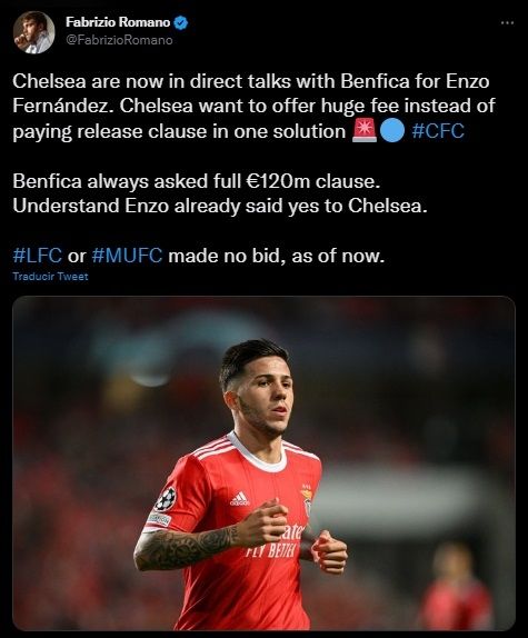 Así lo informó el periodista Fabrizio Romano, conocedor del mercado europeo, en las redes sociales. "El Chelsea está ahora en conversaciones directas con el Benfica por Enzo Fernández. Entiende que Enzo ya le dijo que sí al Chelsea. Liverpool y Manchester United no han ofertado hasta ahora", escribió.