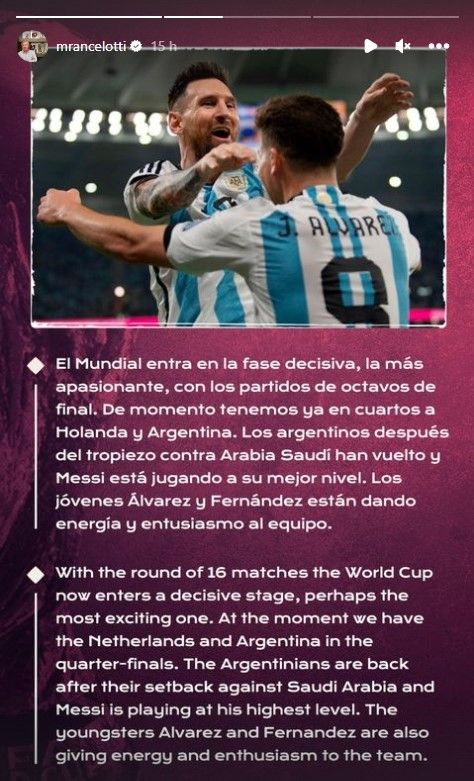 En su cuenta de Instagram, Ancelotti publicó un texto referente a la Copa del Mundo: "El Mundial entra en la fase decisiva, la más apasionante, con los partidos de octavos de final. De momento tenemos ya en cuartos a Holanda y Argentina", comenzó el técnico italiano.