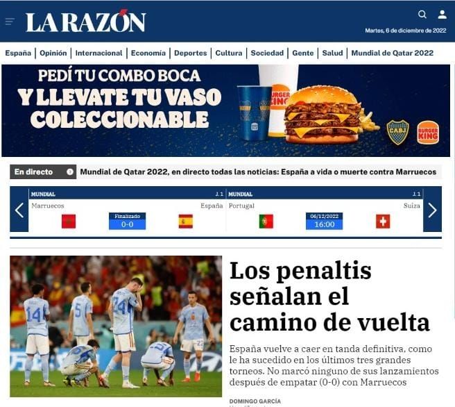 En el batacazo de los octavos de final del Mundial de Qatar 2022, Marruecos eliminó por penales a España, que se fue deshilachando completamente tras su debut esplendoroso con el 7-0 a Costa Rica, y algunos de los portales más importantes del país español cargaron muy duro contra la eliminación del equipo de Luis Enrique.