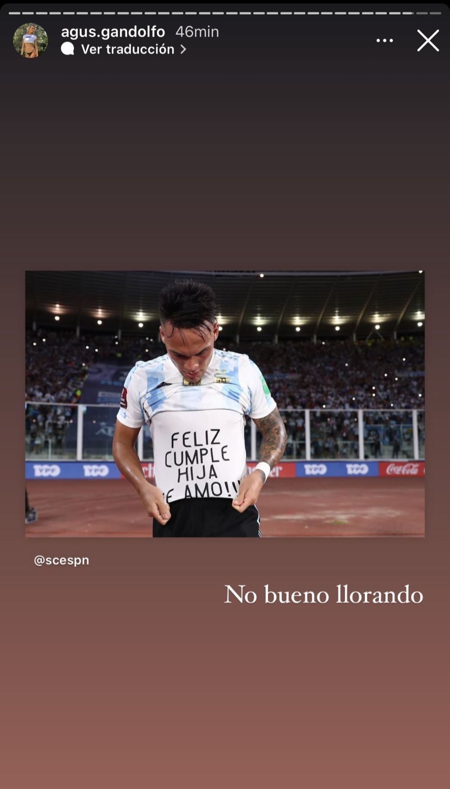 Rápidamente la imagen del goleador se viralizó y llegó a las manos de Agustina Gandolfo, novia del jugador. La joven mendocina eligió las historias de Instagram para mostrar su reacción luego del gol de Lautaro. "No bueno, llorando" posteó Gandolfo junto a la foto del goleador.