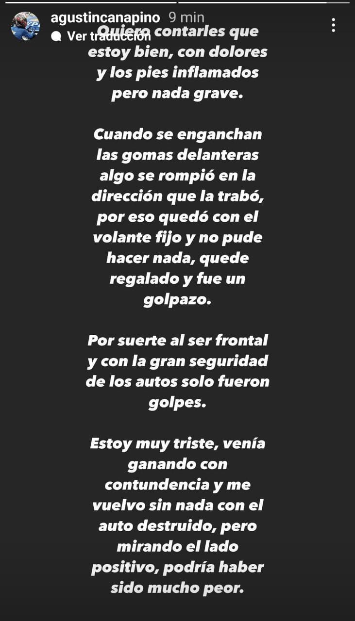 Luego, el piloto se expresó en su cuenta de Instagram para dar tranquilidad: "Quiero contarles que stoy bien, con dolores y los pies inflamados pero nada grave. Cuando se enganchan las gomas delanteras algo se rompió en la dirección que la trabó, por eso quedó con el volante fijo y no pude hacer nada, quedé regalado y fue un golpazo. Por suerte al ser frontal y con la gran seguridad de los autos solo fueron golpes. Estoy muy triste, venía ganando con contundencia y me vuelvo sin nada con el auto destruido, pero mirando el lado positivo, podría haber sido mucho peor", explicó.