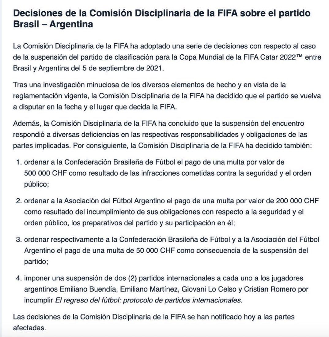 Una de ellas es que los futbolistas de la Selección que fueron "objetados" en su momento (Emiliano "Dibu" Martínez, Cristian Romero, Giovani Lo Celso y Emiliano Buendía) recibieron dos fechas de suspensión por "incumplir el protocolo de partidos internacionales" y otro es que AFA deberá pagar una multa de 250 mil francos suizos (270.000 dólares).