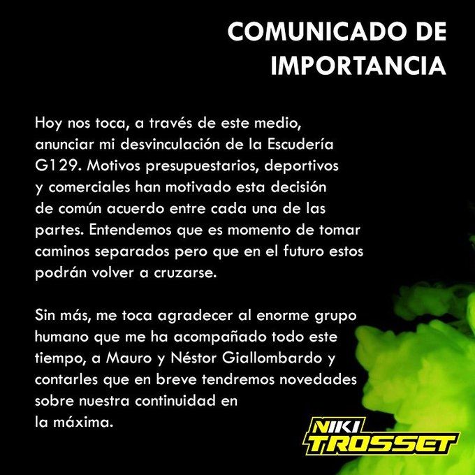 "Hoy nos toca anunciar mi desvinculación de la Escudería G129. Motivos presupuestarios, deportivos y comerciales han motivado esta decisión de común acuerdo entre cada una de las partes. Entendemos que es momento de tomar caminos separados pero que en el futuro estos podrán volver a cruzarse", escribió el de Arrecifes.