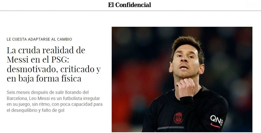 El artículo publicado por El Confidencial expresa que aún no pudo adaptarse a su nueva vida y que no imaginaba encontrar tantas dificultades con este cambio tras 20 años en Barcelona. Lleva como título "La cruda realidad de Messi en el PSG: desmotivado, criticado y en mala forma física" y realiza un resumen de los primeros seis meses de Messi en el PSG.