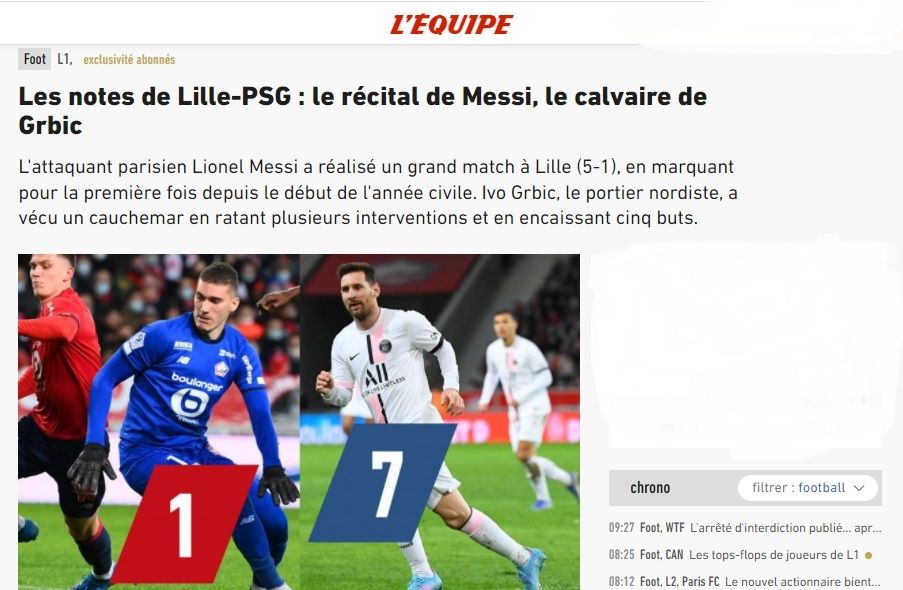 Lionel Messi se va amigando con la prensa francesa. El astro argentino fue clave en la goleada del PSG ante Lille y el diario deportivo L'Equipe, quien ha sido muy duro con el argentino, tituló como un "recital" la actuación de la Pulga en el encuentro donde marcó un golazo y dio una asistencia.