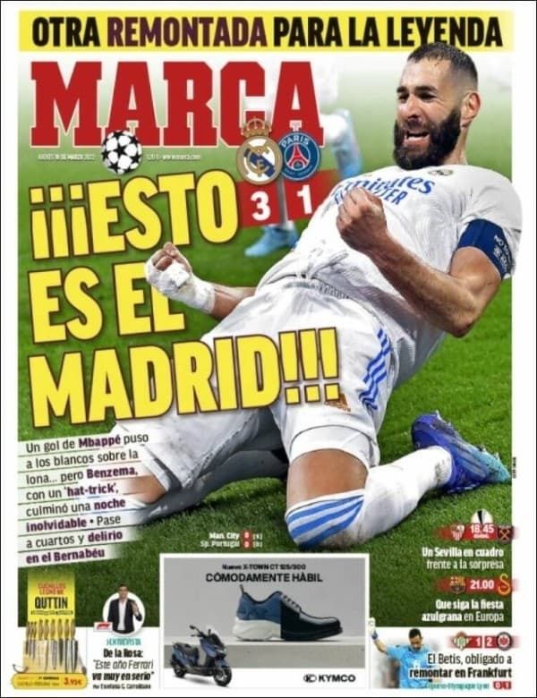 Diario Marca, con una foto de Karim Benzema en la portada, tituló: "¡¡¡Esto es el Madrid!!!". Y lo acompañó con un pequeño análisis: "Un gol de Mbappé puso a los blancos sobre la lona...pero Benzema, con un 'hat-trick' culminó una noche inolvidable. Pase a cuartos y delirio en el Bernabeu".