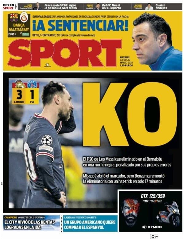 El periódico español Sport eligió una foto de Lionel Messi lamentándose luego de quedar eliminados con el título "KO". "El PSG de Leo Messi cae eliminado en el Bernabéu en una nuche negra, penalizado por sus propios errores. Mbappé abrió el marcador, pero Benzema remontó la eliminatoria con un hat-trick en solo 17 minutos", añadió.