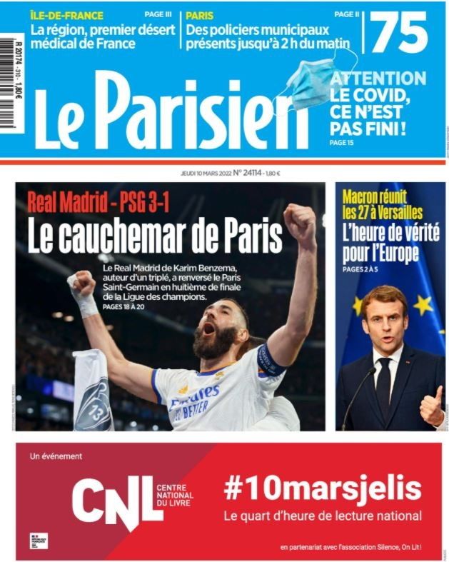 El medio francés Le Parisien eligió una foto de Benzema festejando el tercer gol junto al título: "La pesadilla de París". Además, aagregó: "El Real Madrid de Karim Benzema, autor de un hat-trick, derrocó al París Saint Germain en los octavos de final de la UEFA Champions League".