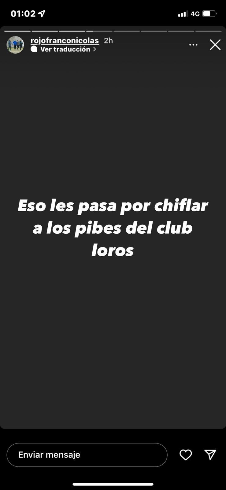 Tras la repercusión del posteo de Micaela, apareció en escena Franco, otro de los hermanos de Rojo. En sus stories de Instagram, cuya cuenta es privada, publicó un mensaje con fondo negro y letras blancas dirigidas a los hinchas de Estudiantes: "Eso les pasa por chiflar a los pibes del club, loros". Fue el periodista Pablo Gravellone quien hizo público el mensaje. "El hermano de Marcos Rojo les dice "loros" a los hinchas de Estudiantes. Se pone bravo el tema", twitteó el hombre de TN.