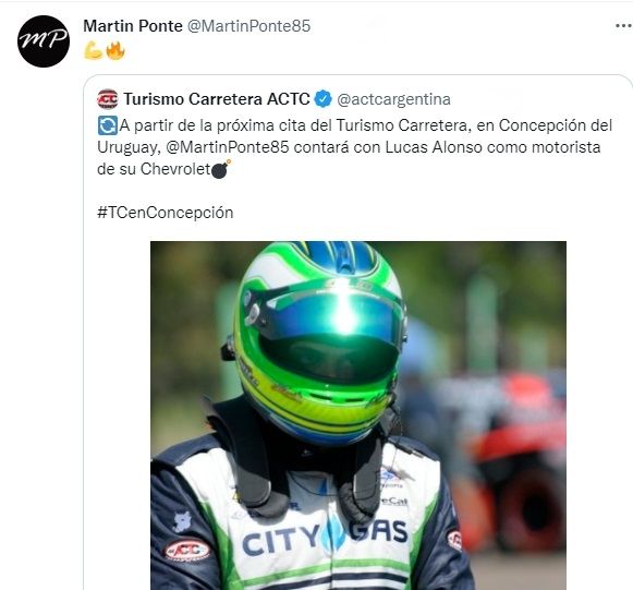 "Tenía trabajo para entretenerme con las otras divisionales de la ACTC. Pero la verdad es que esperaba el llamado para volver al TC. Todos queremos estar en la categoría más importante del país. Ojalá que esta chance que me está dando Martín me abra otras puertas. Ya estoy metido de lleno en el trabajo, es la única forma de estar a la altura", expresó Alonso al respecto.