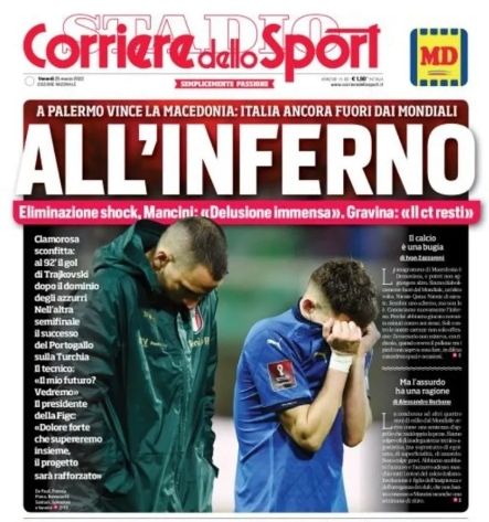 "Al infierno", titula 'Corriere dello sport'. "Macedonia vence en Palermo, Italia se queda sin Mundial. Clamorosa derrota: En el 92, gol de Trajkovski tras el dominio de los 'azurri'", añade el diario, en el que una imagen de los jugadores tapándose la cara con la camiseta.