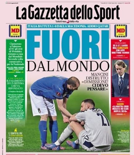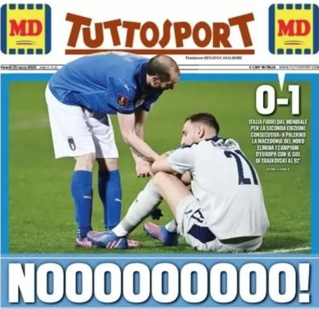 'La Gazzetta dello Sport' abre con una imagen de Giorgio Chiellini, capitán y estandarte del combinado, consolando al guardameta, Giorgio Donnarumma, al final del encuentro: "Fuera del Mundial", rubrica el diario. "En el minuto 92, los héroes de Wembley se quedarán en casa para el mundial. Segunda vez consecutiva para Italia", añade.