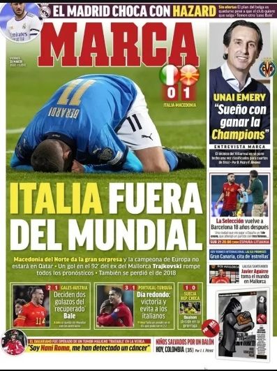 Diario Marca, de España, muestra una foto de Berarde tirado en el césped acompañada del título: "Italia fuera del Mundial". En la descripción, cuenta: "Macedonia del Norte da la gran sorpresa y la campeona de Europa no estará en Qatar. Un gol en el 92' del ex del Mallorca Trajkovski rompe todos los pronósticos".