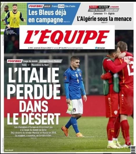 L'Equipe, con una foto del actual jugador del París Saint Germain Marco Verrati, tituló: "Italia perdida en el desierto". "